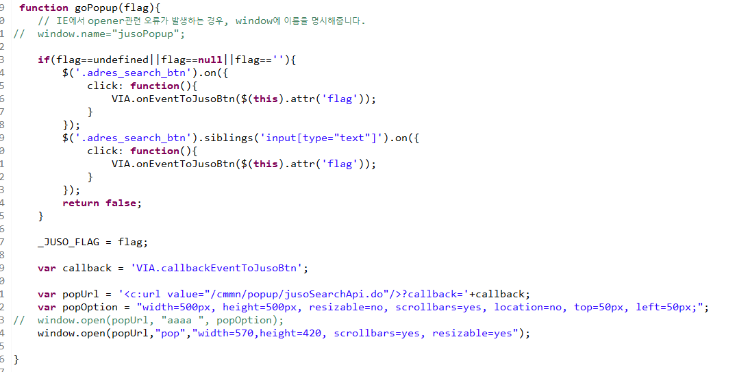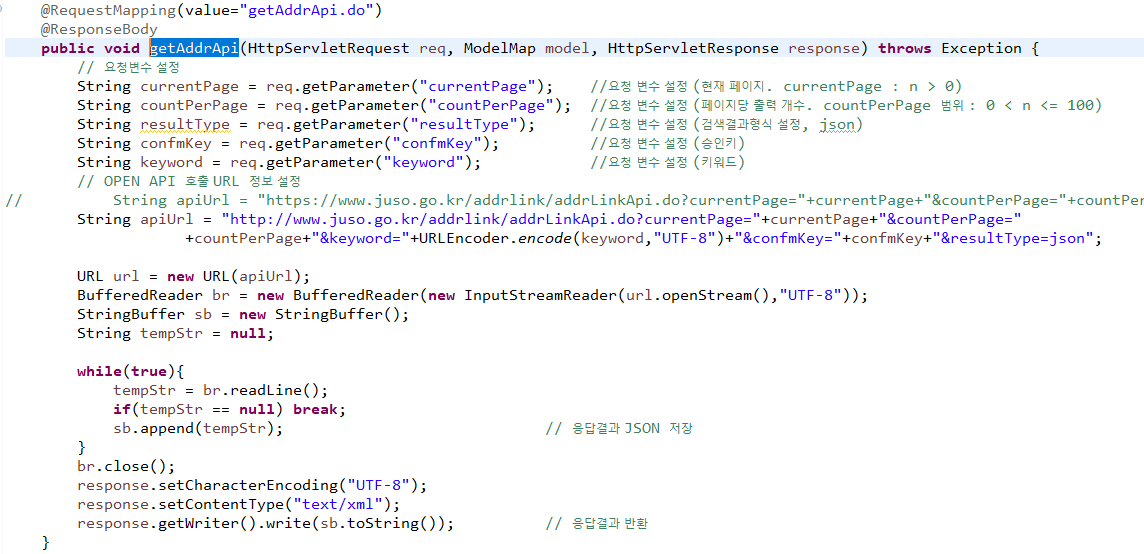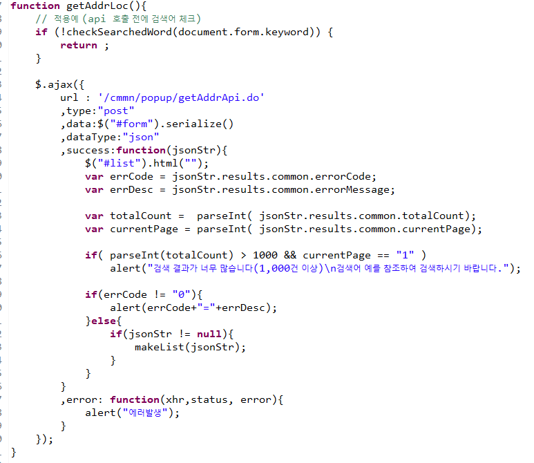 - 원인은 알 수 없었지만, 도로명주소 개발자센터에서 제공하는 '도로명주소 검색API를 활용하여 팝업API 디자인적용한 샘플'로 변경
