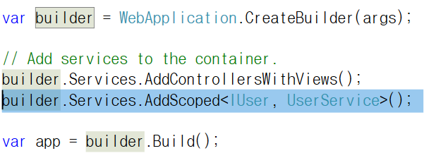 // Startup.cs 파일 내부 ... public void ConfigureServices( ~ ) { services.AddScoped<IUser, UserService>(); // 윗줄 추가!!! 빨간줄은 using 추가해주기.. services.AddMvc(); } - IUser인터페이스 (껍데기)에 UserService 클래스 인스턴스(내용)를 주입한다는 코드.