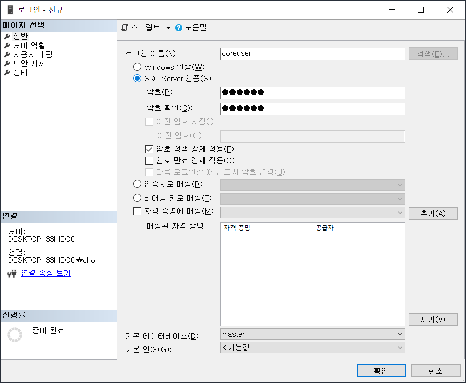 보안 - 로그인 - 우클릭 - 새 로그인을 선택해서 coreuser / corepw 로 추가해준다.