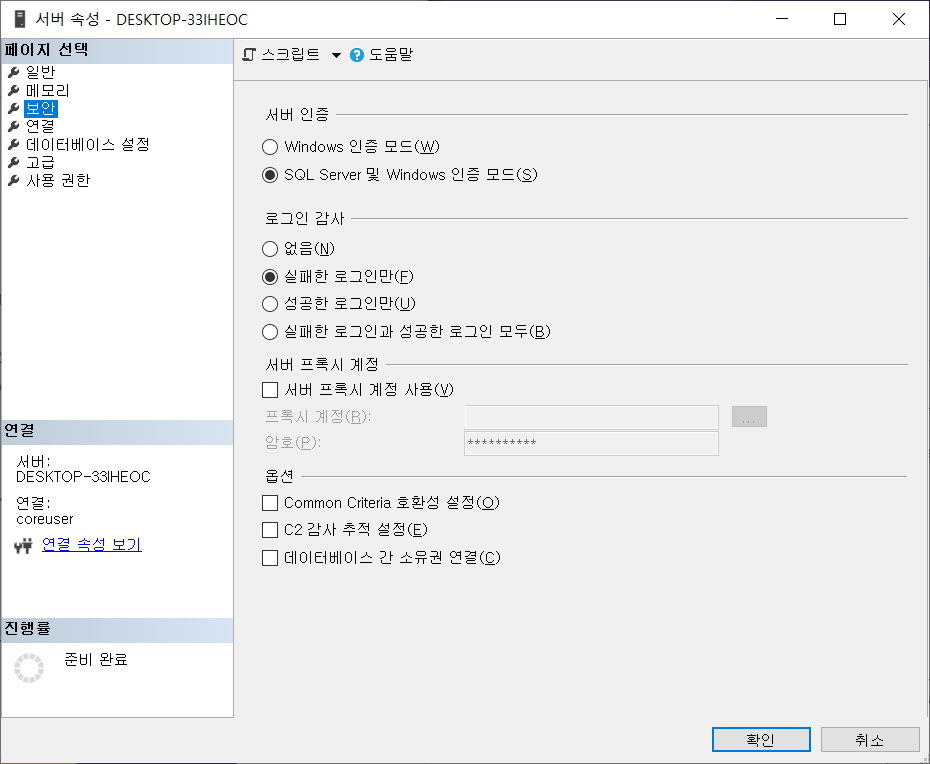 서버 우클릭 - 속성 - 보안에서 Windows 인증모드가 아닌 SQL Server 및 Windows 인증 모드를 선택해야한다.