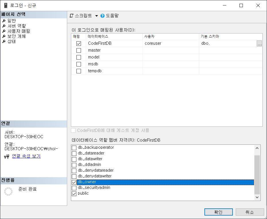 사용자 맵핑에서 CoreFirstDB 를 체크하여 coreuser, 기본스키마는 dbo. 로 작성후, 아래에서 db_owner도 추가한다.