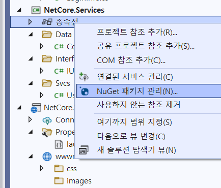 그 후, 종속성 - 우클릭 - 새 참조 추가로 NetCore.Services를 추가해준다.