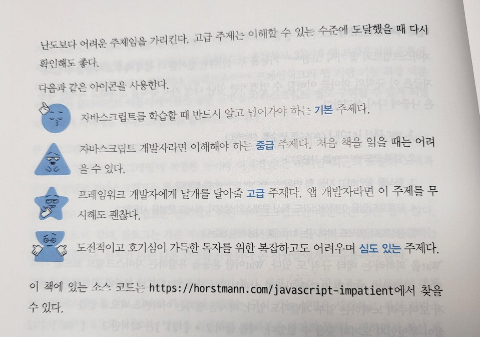 이 책의 특징으로 난이도를 네 가지로 나눠져 있어서기본, 중급, 고급, 심도 있는 주제별로 공부할 수 있다.