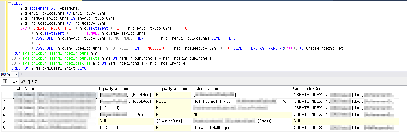 아래 쿼리를 실행해 MissingIndex를 추출한다.