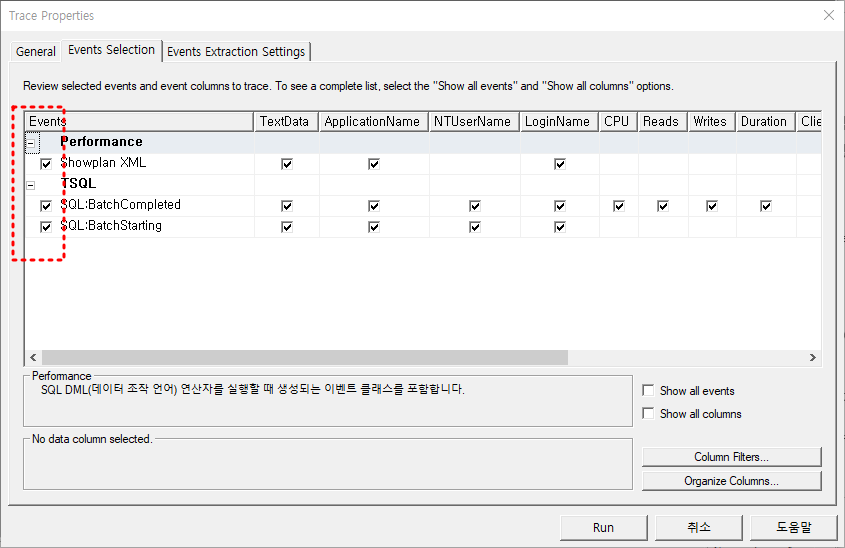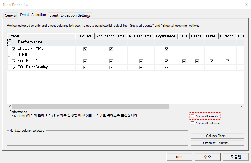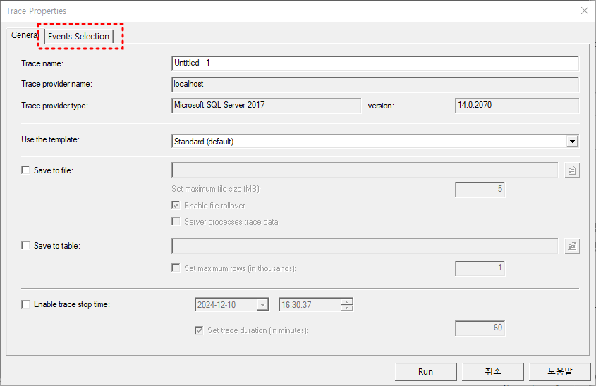 4. Trace Properties 창이 표시되는데 Event Selection 탭을 선택한다.
