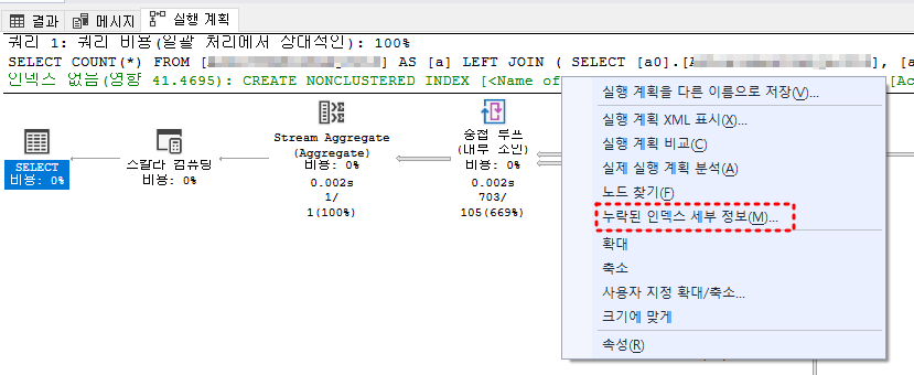 5. 초록색 인덱스 없음 글자 위에서 우클릭 하면 '누락된 인덱스 세부 정보' 라는 메뉴가 표시된다.