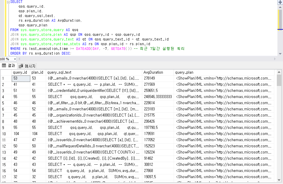 WHERE rs.last_execution_time >= DATEADD(DAY, -7, GETDATE()) -- 최근 7일간 실행된 쿼리
