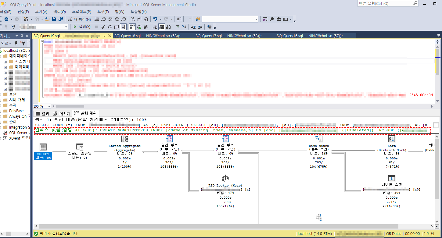 7. 아래 쿼리를 실행해 실행 계획과 Missing index를 확인한다.