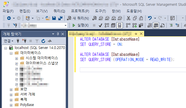 1. SSMS 에서 다음 명령어를 이용해 SQL Server의 Query Store 를 활성화 한다.