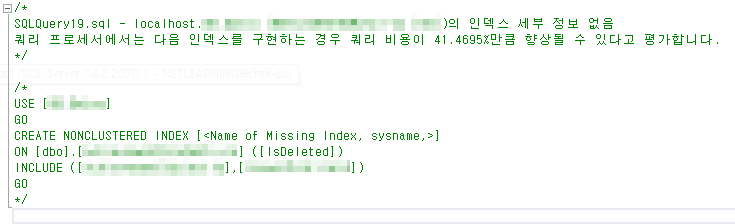 6. '누락된 인덱스 세부 정보' 를 클릭하면 자동으로 생성된 Create 쿼리를 새창에서 확인할 수 있다.