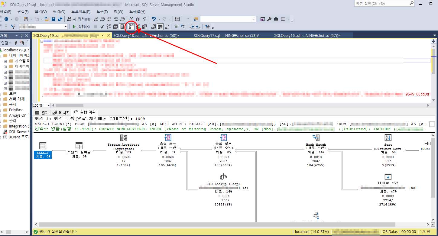 1. SSMS 의 상단 탭에서 [실제 실행 계획 포함] 을 선택한다. ( 단축키 Ctrl + m )